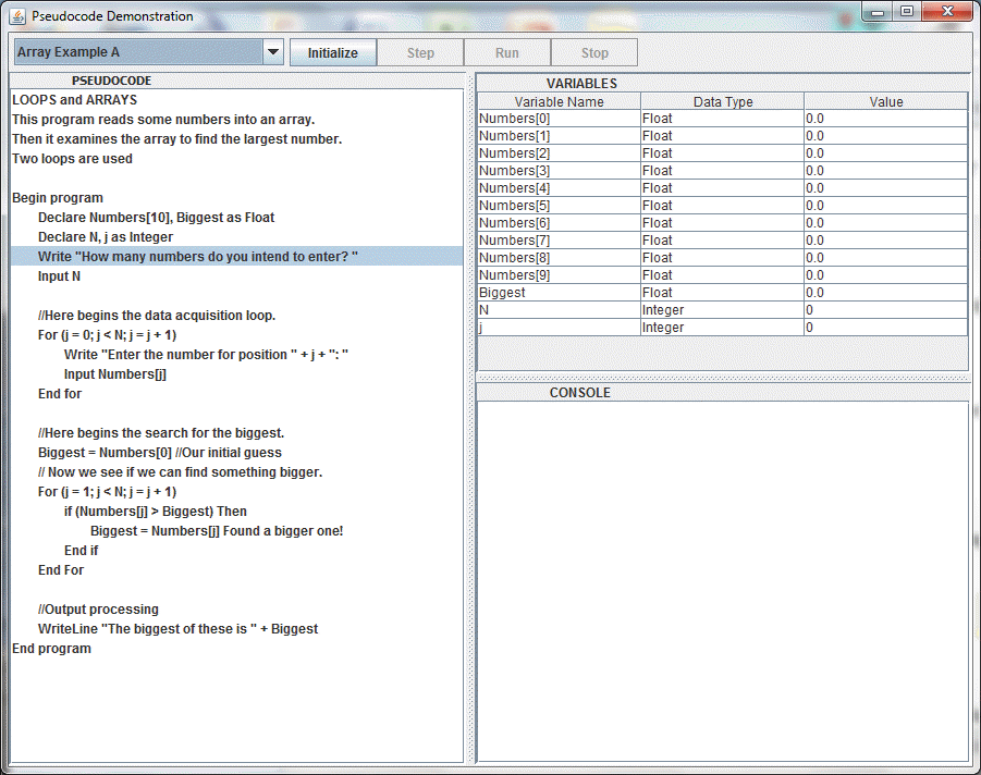 - Array Example A - shows how counter-controlled ("FOR") loops can be used to manage arrays. The program finds the biggest number in a list of numbers entered by the user. The numbers entered are stored in an array, then the array is searched. See Screen Shot!