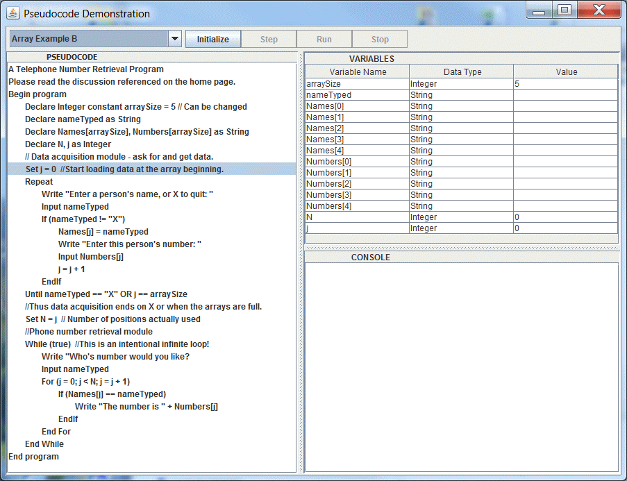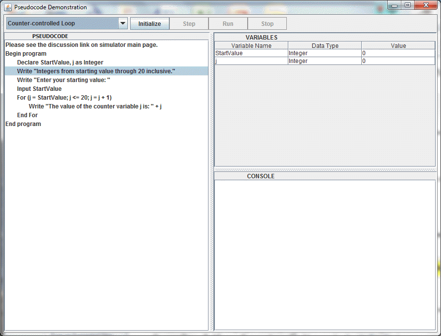 Click Step to execute one line of pseudocode at at time, or