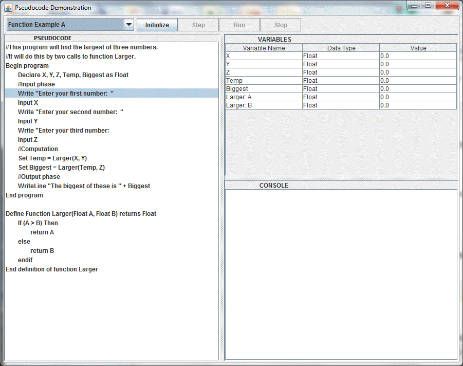 - Function Example A - a simple use of a function. It uses a "larger" function to find the largest of three numbers. See Screen Shot!