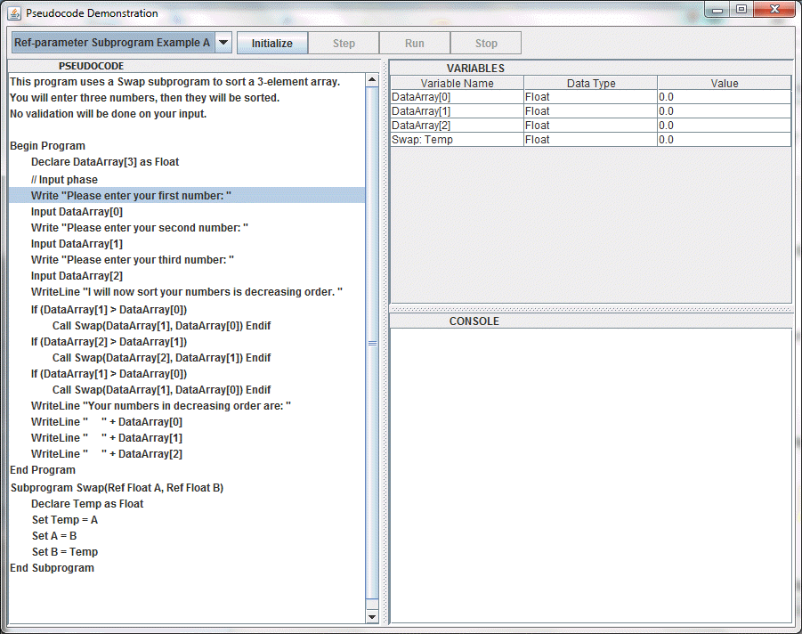 - Reference-Parameter Subprogram Example A - uses a Swap subprogram with two call-by-reference parameters to sort an array of three numbers. In call-by reference, the formal parameters are not separate variables, but are aliases for variables in the client. Note how the ALIAS markings in the variable table change each time Swap is called. See Screen Shot!