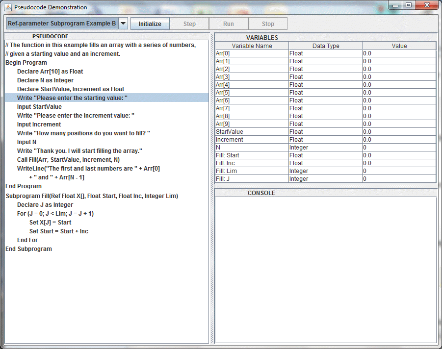 - Reference-Parameter Subprogram Example B - fills an existing array with values, given a start value and an increment (like Fill in Excel). Click here for some discussion of this example. See Screen Shot!